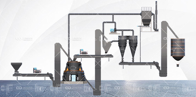 Главный электродвигатель через редуктор приводит во вращение помольный стол, заставляя материал поступать из загрузочного устройства в центр помольного стола. Под действием центробежной силы материал равномерно перемещается от центра к периферии, где крупные куски дробятся, а мелкие частицы формируют уплотнённый слой для межчастичного измельчения. Измельчённый материал выбрасывается за край помольного стола, падает в нижнюю полость и сгребается к разгрузочному устройству скребками. Затем материал транспортируется к сепаратору, где крупная фракция возвращается на доизмельчение, а готовая продукция улавливается пылеуловителем.